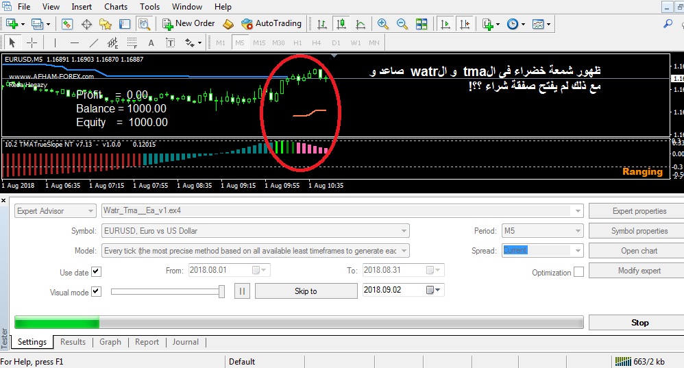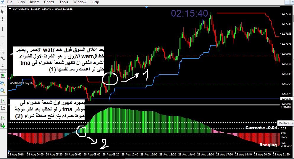 (08-31-2018, 09:26 PM)tarkaan89 كتب : لو افترضنا ان الفريم اللى عليه الاكسبرت فريم ساعة , و السعر الحالى يقف على الساعة 10 مساء . و نحن الان فى منطقة watr هابط , و ال tma  مثلا يعطى اشارة ranging . ممكن فى الساعة 11 نجد ان شمعة ال tma للساعة 7 مساء اصبحت حمراء بينما شمعة الساعة 8 و 9 و 10 ما زالو لون اخضر , ففى هذه الحالة ندخل صفقة بيع ايضا , فشرط دخول البيع لا يشترط ان شمعة الtma  فى الوقت الحالى حمراء . و هذا يرجع الى ان مؤشر tma  يعطى اشارة بدرى او متاخرة لكن مع اشارة الwatr  الثابتة تكون النتيجة جيدا جدا عندما يعملو مع بعض